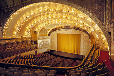 The surrounding atrium features intricate ornamental stenciling – highlighted with 24-karat gold leaf – by The Auditorium architect Louis Sullivan.