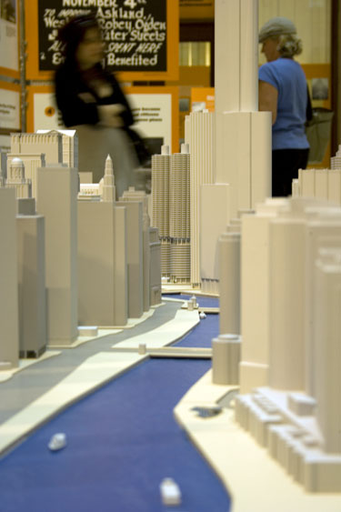 The four square miles represented by the model cover 400 city blocks, from Lake Michigan west to Halsted Street, Oak Street south to 16th Street. Every building is depicted. Lighting simulates a 24-hour day, going from morning to night every 15 minutes. Architects, model makers, and industrial designers worked together to create the exhibit. Columbian Model & Exhibit Works, Ltd., a Chicago company featured in Marina City Online in April, created the models using specialized software and a three-dimensional printer. The exhibit is “designed to get people thinking about how cities develop,” according to a news release. “The exhibition shows how Chicago is a model for understanding all cities.” The exhibition is free and open daily through November 20, 2009.