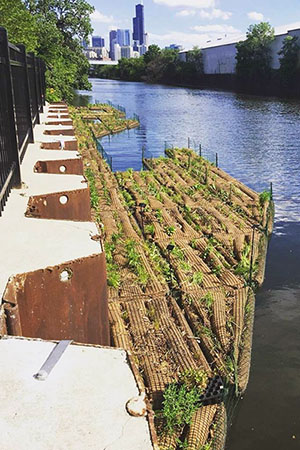 Jun. 28, 2017 – With water quality improving, the only thing keeping the Chicago River from having healthy, optimal fish and wildlife populations is lack of habitat, says a nonprofit team that has installed a 166-square-foot floating garden on the east side of Goose Island. Urban Rivers says the garden, installed June 10-11, will provide habitat to wildlife and serve as a destination for kayakers. Aquatic wildlife needs structure and cover to survive and currently, says Urban Rivers, the Chicago River offers neither.