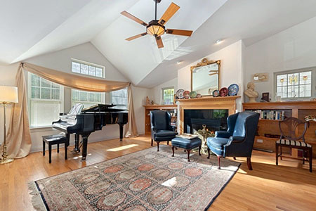 For starters in the living room, Signature Staging recommended removal of antique Oriental rugs, a grand piano, existing artwork, draperies, and all outdated furniture.