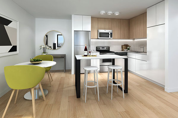 (Above) Kitchen of unit for rent soon at The Kent Apartments, 2625 North Clark Street in Lincoln Park, acquired by Strategic Properties of North America in 2016 and currently being converted from a condominium to an apartment building.