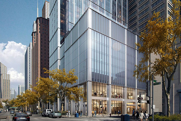 (Above) Rendering by Solomon Cordwell Buenz of the lower floors of a 56-story tower proposed for the corner of North Michigan Avenue & East Erie Street.