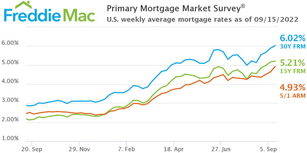 Sep. 21, 2022 – For the first time since late 2008, fixed home loan rates have surpassed 6 percent. On September 15, Freddie Mac’s Primary Mortgage Market Survey reported that benchmark 30-year fixed home loan rates rose to an average of 6.02 percent nationwide, up from 5.89 percent a week earlier. A year ago, 30-year fixed loans averaged only 2.86 percent. ![]() Interest charges on home loans have doubled over the past nine months because the Federal Reserve shifted from a relaxed monetary policy that has supported the economic rebound from the 2020 pandemic recession toward a tighter policy.