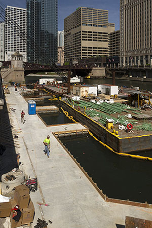 (Above) Tables and umbrellas at longtime vendor O’Brien’s Riverwalk Café. Photo by Michael Kardas. (Click on images to view larger versions.) May 27, 2016 – Remembering how busy the Chicago Riverwalk was over Memorial Day weekend last year, this year’s vendors were arguably feeling pressure to open as soon as possible. O’Brien’s Riverwalk Café announced on Thursday it will open on Friday at 11 a.m. with a “new look” that includes new umbrellas over tables along the Chicago River east of Wabash Avenue. One of the newest Riverwalk vendors was hoping to open this weekend. Lillie’s Park Grill will be the first food and beverage vendor along the stretch of Riverwalk called River Theatre, between Clark and LaSalle Streets. A spokesperson for Lillie’s says they will serve Chicago-style hot dogs, Maxwell Street Polish, nachos, pizza, corn beef, roast beef, and “many other great Chicago food choices.” “There are still some final details before opening – permits and a quick build,” says Gary Foster. The colors of the new space will be red, blue, and yellow, but Foster says it will “blend in” with the Riverwalk. Three other vendors are yet to open – Cyrano’s Café & Wine Bar, west of Columbus Drive, Tiny Hatt, west of Dearborn Street, and a mobile food cart, Dulce in Horto. Fire personnel, says a CFD spokesperson, “allowed vendors to practice pulling someone to the dockwall and throwing ring buoys. The idea is that they have some experience doing both and were able to get directions from the emergency responders of appropriate steps to take in the event of an incident.”