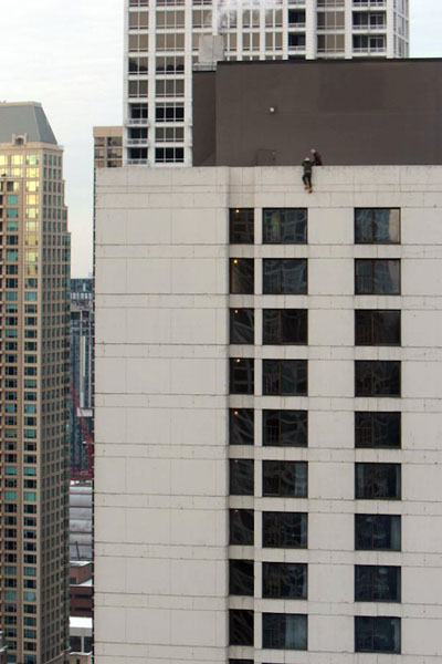 Jan. 16, 2015 – A man wearing a red knit cap, white scarf, and brown boots was photographed hanging by his arms over the side of the roof of the Marriott hotel on Michigan Avenue on Wednesday. A witness saw the man first sit on the edge of the roof, facing south. He then turned around and, gripping something within reach, dangled over the side of a 460-foot building.