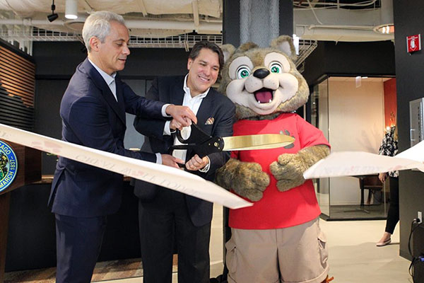Apr. 30, 2017 – (Above) Much to the approval of their mascot, Mayor Rahm Emanuel (left) and CEO Rubén Rodriguez (center) cut a ribbon last Wednesday to officially open the corporate headquarters of Great Wolf Resorts at River North Point, formerly known as 350 West Mart Center.